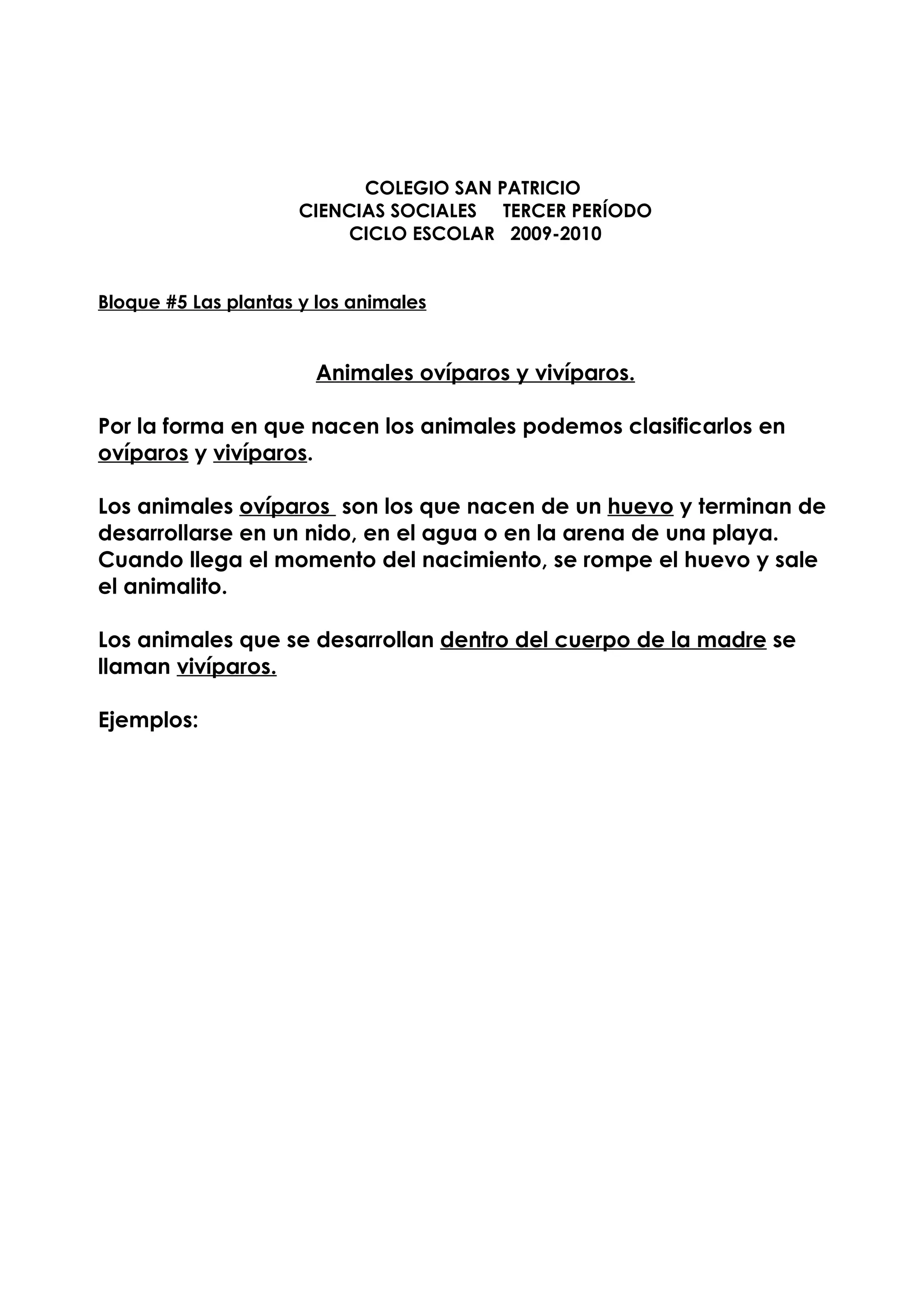 Este documento clasifica a los animales en ovíparos y vivíparos dependiendo de cómo nacen, y explica que los ovíparos eclosionan de huevos mientras que los vivíparos se desarrollan dentro del cuerpo de la madre. También distingue entre animales herbívoros que se alimentan de plantas y animales carnívoros que se alimentan de otros animales.