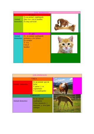 El documento describe diferentes animales domésticos y salvajes. Entre los animales domésticos se encuentran el perro, que vive con los humanos y es servicial; el gato, un felino cazador que también vive con los humanos; la vaca, que da leche y es vegetariana; y el caballo cuadrúpedo que come frutas y se usa para cabalgar. El único animal salvaje mencionado es el tigre, un depredador carnívoro.