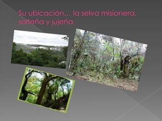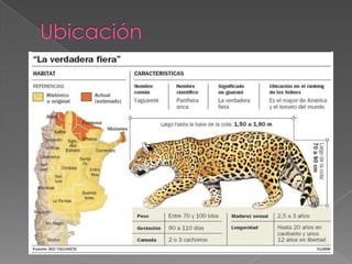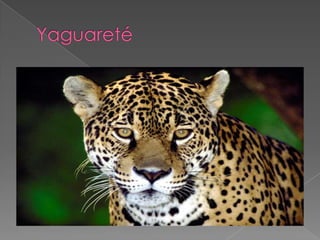 El yaguareté es el felino más grande de América, pesa entre 70-130 kg y mide 80 cm de alto. Caza acechando y saltando sobre su presa para romperle el cuello con sus fuertes caninos. Se encuentra en peligro de extinción debido a la caza por su valiosa piel y la pérdida de hábitat por el desarrollo en el Chaco. Para protegerlo es necesario conservar su hábitat y áreas protegidas libres de caza.