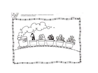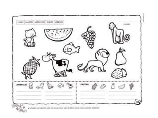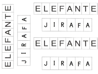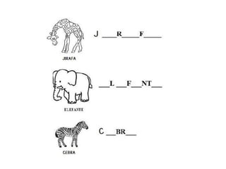 El documento presenta una adivinanza sobre un animal grande con cola y trompa que es un elefante. También incluye instrucciones para unir nombres de animales como león, elefante, mono y jirafa con sus ilustraciones respectivas y colorearlas.