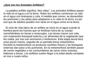 Los animales anfibios, que comienzan su vida en el agua como larvas y luego evolucionan para vivir tanto en agua como en tierra, tienen un ciclo de vida que incluye metamorfosis. Poseen características como ser vertebrados, de sangre fría y ovíparos, con una piel permeable que les permite respirar por cutánea y pulmonar. Se distribuyen en hábitats en todos los continentes excepto en la Antártida y varían en tamaño desde la salamandra gigante hasta la ranita pigmea.