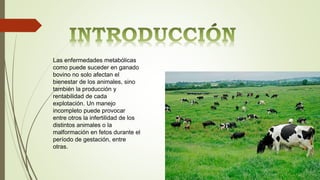 Las enfermedades metabólicas en ganado bovino como la cetosis y la hipomagnesemia afectan el bienestar animal y la producción. La cetosis ocurre en vacas lecheras en las primeras semanas de ordeño debido a bajos niveles de glucosa, mientras que la hipomagnesemia se debe a baja ingesta de magnesio y causa tetania. El buen manejo y alimentación son importantes para prevenir estas enfermedades.