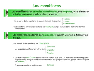 Los mamíferos son animales vertebrados vivíparos que se alimentan de leche materna al nacer. Son los únicos animales con pelo y pueden vivir en la tierra o el agua respirando con pulmones. Los principales grupos de mamíferos son terrestres, acuáticos, carnívoros, ungulados, primates y cetáceos.