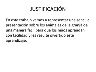 Este documento presenta información sobre diferentes animales de granja de una manera simple para que los niños aprendan fácilmente. Describe las características y usos de animales como ovejas, cerdos, caballos, vacas, cabras, gallos, gallinas, gatos, perros, conejos y burros. También incluye actividades interactivas para reforzar los conceptos aprendidos.