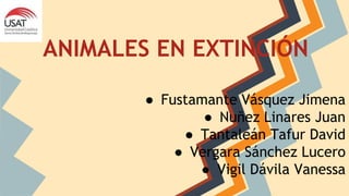 El documento presenta información sobre varios animales en peligro de extinción como el leopardo de las nieves, el orangután, el tigre de Bengala y el oso polar. Cada animal es descrito brevemente con detalles sobre su hábitat, alimentación, comportamiento y las principales amenazas que enfrentan como la pérdida de hábitat y la caza furtiva.