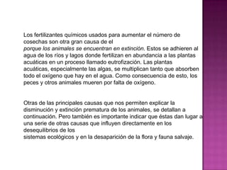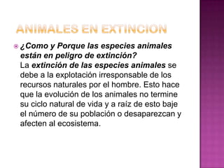 El documento describe varias especies de animales endémicas del Perú que se encuentran en peligro de extinción debido a factores como la destrucción de sus hábitats, la caza furtiva, la contaminación de ríos y lagos, y el crecimiento descontrolado de la población humana. Entre las especies mencionadas se incluyen el mono Choro de cola amarilla, la rana del Lago Titicaca, el Huapo colorado, un ave que vive cerca a Machu Picchu, y un ave del Amazonas peruano con plum