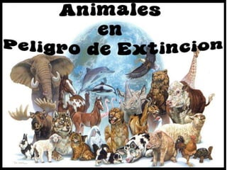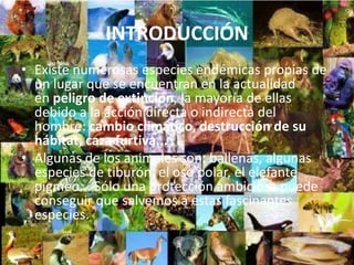 Este documento describe varias especies animales endémicas que se encuentran actualmente en peligro de extinción debido a la acción del hombre, como el cambio climático, la destrucción de hábitat y la caza furtiva. Entre ellas se encuentran el rinoceronte de Java, el leopardo de las nieves, el tigre, el atún rojo, el elefante asiático, la vaquita marina, el gorila de montaña y el delfín del río Irrawaddy, cuya poblaciones se han reducido drásticamente