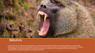 El documento describe varios animales peligrosos, incluyendo abejas asesinas, babuinos, mambas negras, jabalíes y hipopótamos. Se menciona que las abejas asesinas atacan en grupo, los babuinos son agresivos entre sí y protegen a sus hembras, mientras que las mambas negras son rápidas y extremadamente venenosas. Además, se destaca la agresividad de los jabalíes y la capacidad de los hipopótamos para causar daño, especialmente al defender su territorio y a sus crías.