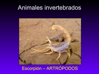 El documento lista diferentes tipos de animales invertebrados, incluyendo artrópodos como escorpiones, arañas y avispas, moluscos como caracoles y bivalvos, cnidarios como anémonas y corales, crustáceos como cangrejos, equinodermos como erizos de mar, gusanos como lombrices de tierra y planarias, y organismos unicelulares como paramecios y trypanosomas.