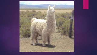 Este documento presenta una variedad de animales nativos de Perú, incluyendo el perro peruano sin pelo, el gallito de las rocas naranja, los pingüinos de Humboldt que viven en el desierto, los delfines rosados en el Amazonas, el cuy como mascota y plato de comida, las alpacas y vicuñas por su lana fina, las llamas en los Andes, el cóndor volando en los picos andinos, y el oso de anteojos en los bosques de montaña.