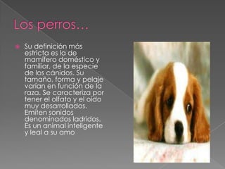Este documento resume diferentes tipos de mascotas populares, incluyendo perros, gatos, pájaros y peces. Proporciona ejemplos de razas de perros como el pastor alemán y de gatos como el abisinio. Explica que los pájaros pertenecen al orden de los passeriformes y se dividen en cuatro grupos. Finalmente, destaca la diversidad de peces que pueden vivir en agua dulce o salada.