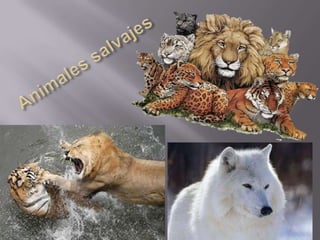 El documento describe brevemente cuatro animales: leones, tigres, lobos y elefantes. Los leones viven en manadas y los machos son más grandes que las hembras. Los tigres son depredadores solitarios que cazan diferentes presas según su hábitat. Los lobos viven en manadas territoriales y cazan en grupo, mientras que la pareja dominante cría a los cachorros. Los elefantes africanos son los animales terrestres más grandes, con los machos más grandes que las hembras.