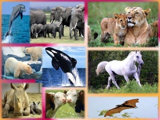 El documento clasifica los principales tipos de animales en vertebrados e invertebrados. Los vertebrados, que tienen esqueleto, incluyen peces, anfibios, reptiles, aves y mamíferos. Cada grupo se caracteriza por su forma de nacer, respirar y desplazarse. Los invertebrados no tienen esqueleto.