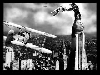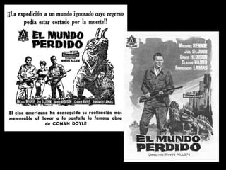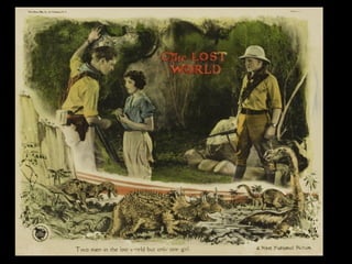 El documento presenta un recorrido por la representación de animales gigantes en el cine desde 1925 hasta 1957, destacando títulos icónicos como 'El mundo perdido', 'King Kong', y 'Godzilla'. A través de diversas películas, se exploran temas de terror, ciencia ficción y alegorías sociales, especialmente en relación a la amenaza nuclear y los peligros de la manipulación de la naturaleza. Se destacan la evolución de las técnicas de efectos especiales y la influencia cultural que estas películas han ejercido a lo largo del tiempo.