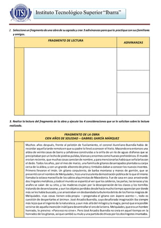 Este resumen describe un taller para desarrollar habilidades de lectura en casa. El taller incluye tres actividades: 1) leer un fragmento y responder preguntas, 2) seleccionar un fragmento de una obra y crear acertijos, y 3) leer otro fragmento y responder consideraciones sobre la lectura. El objetivo es aplicar estrategias de lectura para mejorar la comprensión, adquirir vocabulario y gusto por la lectura.