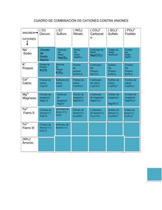 Este documento presenta un cuadro de combinaciones de cationes (sodio, potasio, calcio, magnesio, hierro II, hierro III, amonio) contra diferentes aniones (cloruro, sulfuro, nitrato, carbonato, sulfato, fosfato). En cada casilla se enumeran los nombres de las sales resultantes de la combinación del catión y anión correspondientes.