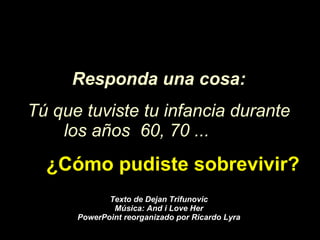 El documento describe cómo era la vida de los niños en las décadas de 1960 y 1970, una época en la que no existían muchas de las medidas de seguridad actuales. Los niños jugaban libremente en la calle sin supervisión, bebían agua sin tratar y comían dulces en abundancia. A pesar de ello, el documento argumenta que los niños de esa generación eran felices y lograron desarrollar su personalidad a pesar de vivir en un mundo que ahora se considera más inseguro.
