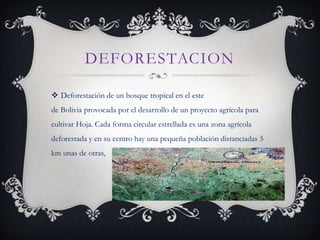 Este documento trata sobre la deforestación a nivel mundial. Explica que la deforestación ha sido un proceso que se ha incrementado en los últimos tres siglos, deforestando un promedio de 6 millones de hectáreas anuales, ocurriendo principalmente en América Latina, África Occidental y partes de Asia. También describe brevemente la historia de la deforestación y sus efectos en regiones como África y Europa.