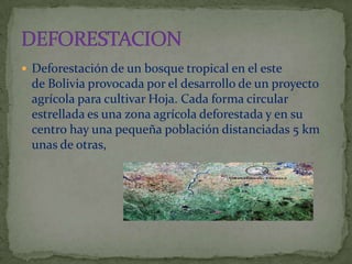 El documento describe la deforestación causada por un proyecto agrícola en Bolivia para cultivar hoja. La deforestación conduce a la erosión del suelo y degradación de la tierra. Factores como el descuido, falta de valoración y leyes deficientes contribuyen a la deforestación a gran escala. La deforestación se ha incrementado en los últimos siglos debido al desarrollo agrícola y actualmente ocurre principalmente en América Latina, África y Asia.