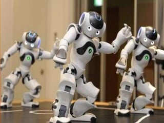 El documento describe el desarrollo histórico de los robots, incluyendo los primeros robots humanoides programables creados por Al Jasaría en 1206, juguetes mecánicos complejos creados por el artesano japonés Hisasige Tanaca en el siglo XIX, y los primeros intentos de crear robots con ruedas y múltiples patas que imitaban insectos. También discute robots humanoides comercializados por Honda y Sony a partir de 2002.