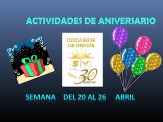 El documento describe las actividades planeadas para celebrar el 30 aniversario de una escuela, incluyendo la creación de dibujos y poemas por parte de los estudiantes, un acto de inicio con himno nacional, presentaciones de gimnasia rítmica y deportes, un desfile de disfraces, festival de canto interescuelas y baile para celebrar.