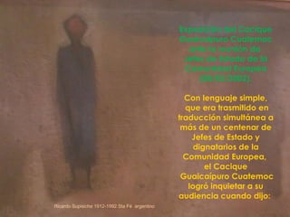 El documento discute las afirmaciones del Cacique Guaicaipuro Cuatemoc sobre la deuda histórica de Europa hacia América, enfatizando la percepción de que el oro y la plata traídos de América a Europa deben ser considerados como préstamos. Se critica la incapacidad de Europa para devolver esta 'deuda' y se argumenta que se debe evaluar la explotación histórica de los recursos americanos como un tema de derechos internacionales. El texto también plantea la necesidad de que los gobiernos latinoamericanos hagan un reclamo formal ante tribunales internacionales respecto a esta deuda.