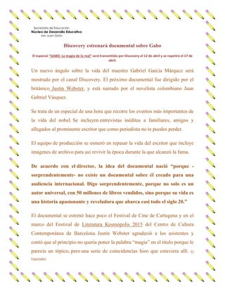El documental "GABO: La magia de lo real" sobre la vida del escritor Gabriel García Márquez se transmitirá por Discovery el 12 y 17 de abril. Dirigido por Justin Webster y narrado por Juan Gabriel Vásquez, el especial de una hora incluye entrevistas con familiares y amigos del autor así como imágenes de archivo para repasar su vida y época de fama. El director se sorprendió de que no existiera un documental sobre García Márquez hecho para audiencias internacionales, dado que es un autor universal con 50 millones de libros vendidos