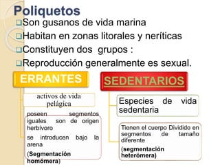 Este documento clasifica y describe los principales grupos de anélidos. Los poliquetos son anélidos marinos con segmentos iguales o desiguales, y pueden ser errantes o sedentarios. Dentro de los sedentarios se encuentran los tubícolas, excavadores y otros. La morfología de los poliquetos incluye segmentos corporales y estructuras como el prostomio y pigidio. Existen diversas adaptaciones como poliquetos superficiales, pelágicos, excavadores y otros. La mayoría tienen reproducción sexual con gametos que maduran en el