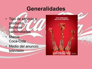 Este documento analiza un anuncio publicitario de Coca-Cola. El anuncio promueve la marca posicionándola como una fuente de felicidad para el público en general a través de un tono emocional. Muestra personas disfrutando en familia para comunicar que beber Coca-Cola brinda la misma felicidad que tener hijos. El eslogan es "Destapa la felicidad".