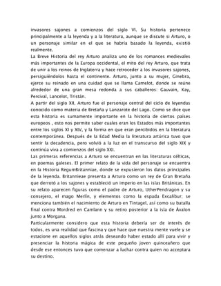 El libro analiza la historia del rey Arturo, un destacado personaje de la literatura europea que según algunos fue un caudillo británico que defendió Gran Bretaña de los invasores sajones en el siglo VI. Aunque su historia pertenece principalmente a la leyenda, el autor busca revelar los hechos históricos sobre Arturo y explicar cómo la leyenda ha evolucionado a través de los siglos a manos de poetas y pintores. El libro también intenta despejar las dudas sobre la existencia de Arturo y resalt