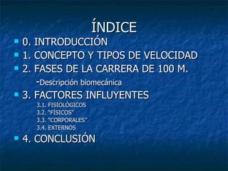 Este documento analiza la biomecánica de los 100 metros planos. Explora las diferentes fases de la carrera, incluida la respuesta al disparo, la aceleración y el mantenimiento de la velocidad máxima. También discute los factores fisiológicos, físicos, dinámicos y externos que influyen en el rendimiento, como la estatura, la fuerza muscular, la frecuencia y amplitud de los pasos, y las condiciones ambientales. El objetivo final es que los velocistas optimicen su técnica corporal de