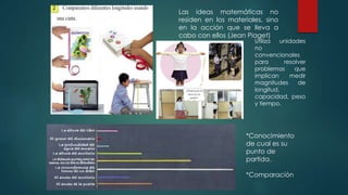 El documento presenta tres actividades para enseñar conceptos matemáticos a niños de primaria. La primera actividad enseña a diferenciar entre objetos largos y anchos. La segunda involucra medir cadenas de papel para comparar longitudes. La tercera actividad requiere que los niños identifiquen cuál número es más grande entre opciones sencillas. El objetivo general es que los niños aprendan conceptos matemáticos básicos como la medición y la comparación de manera lúdica e interactiva.
