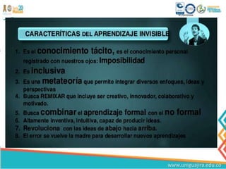 El documento propone un paradigma educativo inclusivo y flexible llamado 'aprendizaje invisible', que busca integrar diversas perspectivas para mejorar el aprendizaje y el desarrollo humano. Se abordan cinco ejes del aprendizaje que destacan las competencias invisibles en entornos formales e informales, así como la necesidad de reconocer el impacto de las tecnologías en estos procesos. A lo largo del texto, se critica la rigidez de la educación formal actual frente a las demandas de un aprendizaje continuo y sostenible.