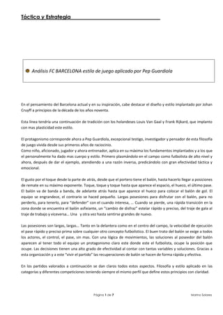 El documento analiza el estilo de juego implementado por Pep Guardiola en el FC Barcelona, caracterizado por la posesión del balón, el toque rápido y preciso, y los movimientos coordinados entre los jugadores para crear espacios. El equipo presiona agresivamente sin balón y transiciona rápidamente entre la fase defensiva y ofensiva. El documento también describe las tácticas y consignas específicas utilizadas en diferentes zonas del campo y situaciones de juego.