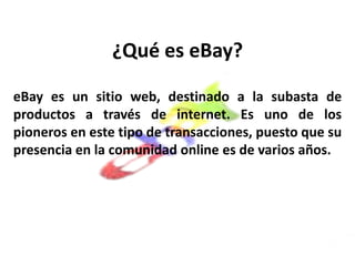 eBay es un sitio web pionero de subastas en internet fundado en 1995. Ofrece la venta de más de 50 millones de artículos diarios en categorías variadas. Su éxito se debe a contar con una gran base de usuarios compradores y vendedores, y ofrecer un ambiente seguro y entretenido para realizar transacciones. Para mantener su liderazgo debe enfocarse en la innovación, expansión internacional, y asegurar la confianza y satisfacción de los usuarios.