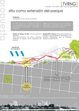 El documento describe seis elementos clave cercanos al sitio que se intervendrá: 1) una ciudad vecina que proporciona turistas y consumidores potenciales, 2) un puente existente que atrae visualmente, 3) el Río Paraná que permite el acceso, 4) una punta con vistas importantes, 5) un parque que podría utilizarse como extensión, y 6) la ciudad de Corrientes y su vinculación directa con el sitio. Estos elementos son fundamentales para el desarrollo del proyecto.