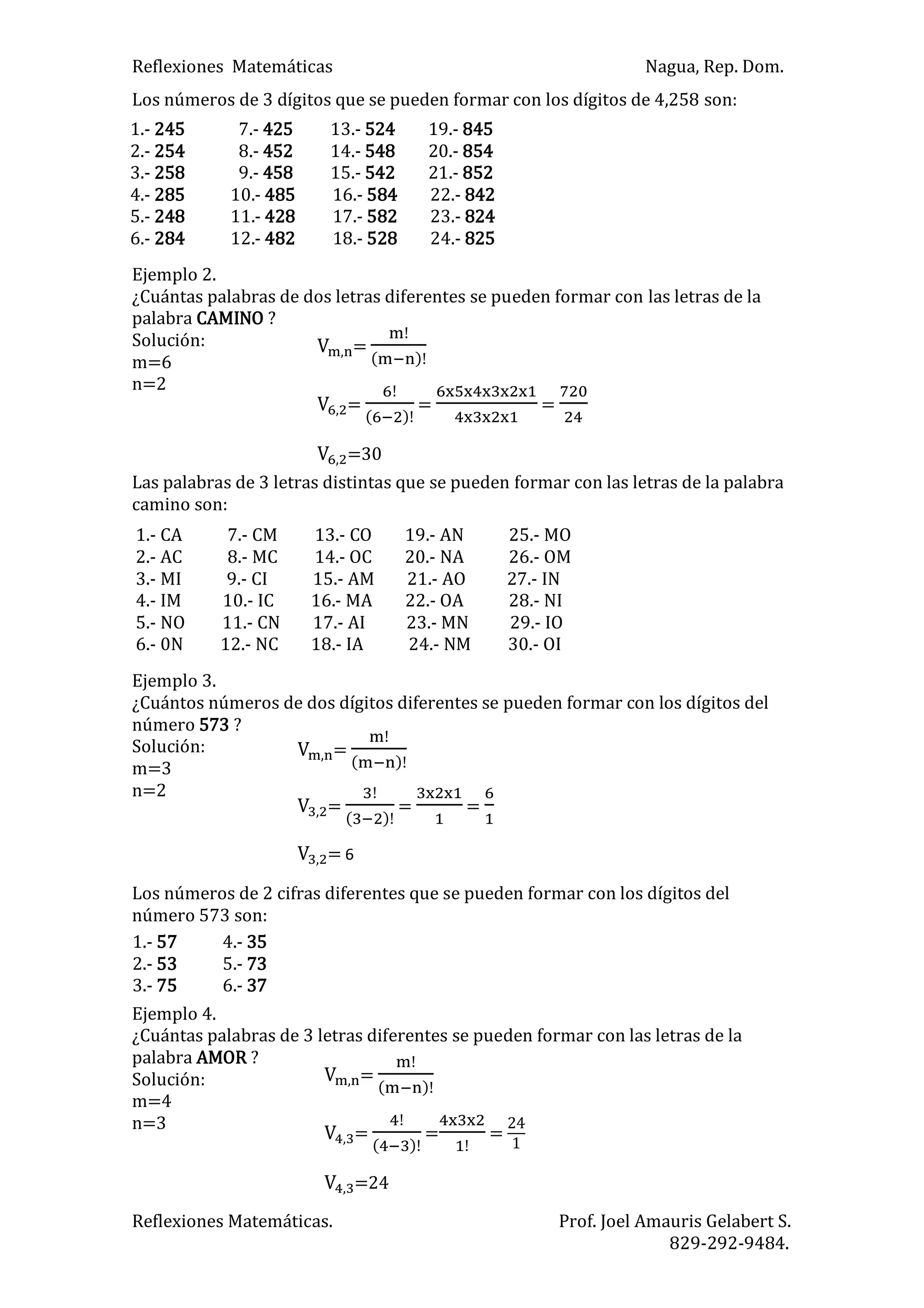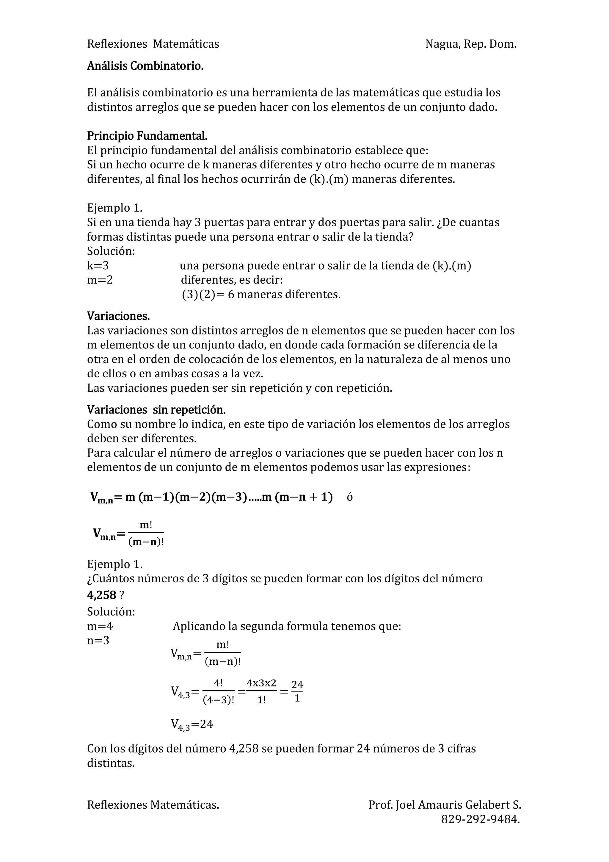 Este documento presenta una introducción al análisis combinatorio y conceptos matemáticos como variaciones, permutaciones y combinaciones. Explica las fórmulas para calcular el número de arreglos posibles de elementos en un conjunto y proporciona ejemplos resueltos de problemas que involucran estas técnicas.