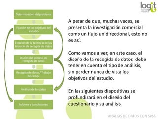 El documento describe los pasos para realizar un análisis estadístico de datos con el programa SPSS. Explica cómo crear y modificar variables, cargar y modificar datos, y realizar