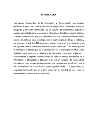 El documento analiza cómo la implementación de tecnologías de la información y comunicación (TIC) puede ofrecer ventajas competitivas a las organizaciones, mejorando la eficacia laboral y la reducción de costos. Destaca la importancia de utilizar adecuadamente estas tecnologías y su rol en la automatización de procesos y en el diseño organizacional. Se concluye que las TIC han transformado el funcionamiento de las empresas, permitiéndoles adaptarse mejor a las necesidades del mercado y mantenerse competitivas.