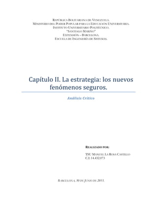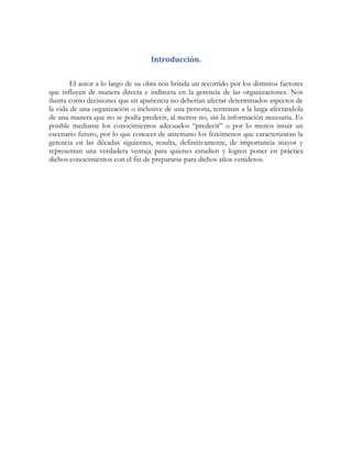 Este documento resume un capítulo sobre los nuevos fenómenos que influirán en las estrategias gerenciales en las próximas décadas. Identifica seis fenómenos clave: 1) la tasa de natalidad descendente, 2) cambios en la distribución del ingreso, 3) industrias emergentes y decrecientes, 4) necesidad de redefinir el desempeño más allá de lo financiero, 5) importancia de la competitividad global, y 6) la creciente brecha entre la realidad económica y política. Concluye que las