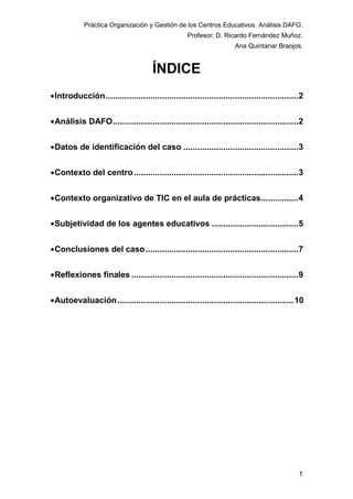 Este documento presenta un análisis DAFO (fortalezas, debilidades, oportunidades y amenazas) de las TIC en un centro educativo. Describe el contexto del centro y el uso limitado de las TIC. El análisis encuentra que el centro carece de recursos tecnológicos y que los maestros no están bien capacitados para integrar las TIC, a pesar de reconocer sus beneficios. Se concluye que aunque se añadieran más recursos, probablemente no se usarían debido a la falta de formación del