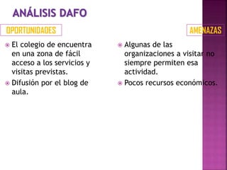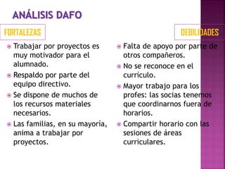 El documento analiza las fortalezas, debilidades, oportunidades y amenazas de trabajar por proyectos en una escuela. Entre las fortalezas se encuentran que es motivador para los estudiantes y que cuentan con el apoyo del equipo directivo y los recursos materiales necesarios. Las debilidades incluyen falta de apoyo de otros profesores, mayor trabajo para los profesores y compartir horario con otras asignaturas. Las oportunidades son la ubicación accesible de la escuela y la difusión a través del blog del aula. La amen