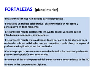 El documento presenta un análisis DAFO de un proyecto educativo. Entre las fortalezas se encuentra que los alumnos con necesidades educativas especiales han iniciado parte del proyecto de forma colaborativa y motivadora. Las debilidades incluyen fallos en la conexión a internet y falta de recursos tecnológicos. Las oportunidades son la posible colaboración con otros centros y el protagonismo creciente de las TIC. Las amenazas son la escasez de equipos y la resistencia al cambio de algunos profesores