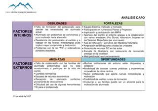 El documento presenta un análisis DAFO del centro educativo, identificando factores internos como debilidades (falta de formación del profesorado y problemas con alumnos y tecnología) y fortalezas (implicación de directiva, participación en proyectos y colaboraciones). También analiza factores externos, señalando amenazas (falta de colaboración familiar y cambios normativos) y oportunidades (disposición de instituciones a colaborar y posibilidad de formación).
