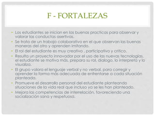 Este proyecto sobre los buenos modales tiene varias fortalezas como enseñar conductas asertivas de forma colaborativa e innovadora usando tecnología. También tiene oportunidades como recibir apoyo de otros profesores y crear comunidades de aprendizaje virtual. No obstante, tiene debilidades como falta de espacio físico y equipos, e incertidumbre sobre el trabajo por proyectos. Asimismo, enfrenta amenazas como escasez de equipos informáticos y resistencia al cambio de algunos profesores.