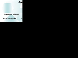 Este documento presenta un análisis de las causas básicas de los accidentes. Identifica dos causas principales: actos inseguros y condiciones inseguras. Estas causas se generan cuando existen fallas en los sistemas de la organización que toleran comportamientos de riesgo, como la falta de procedimientos claros o la falta de aplicación de medidas disciplinarias. También se generan cuando el personal no percibe adecuadamente los riesgos o el equilibrio entre beneficios y pérdidas de sus acciones. El documento propone sol