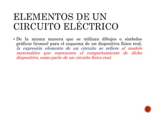 El documento proporciona una introducción a los diferentes tipos de elementos de circuitos eléctricos, incluyendo conductores, aislantes, semiconductores, baterías, fuentes de alimentación y celdas solares. Describe las propiedades de estos elementos y cómo se clasifican, así como sus usos comunes en dispositivos electrónicos y sistemas de suministro eléctrico.
