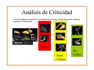 El documento describe el análisis de criticidad, el cual permite establecer prioridades entre procesos, activos, sistemas, equipos y componentes. El análisis clasifica los elementos como críticos, semi-críticos o no críticos dependiendo de factores como la frecuencia de fallas, el impacto operacional, la flexibilidad operacional, el costo de mantenimiento, y la seguridad y el medio ambiente. Además, define la fórmula para calcular la criticidad como la frecuencia multiplicada por las consecuencias.