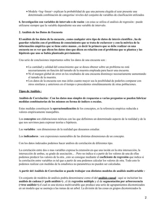 El documento presenta una introducción al análisis de datos de encuestas, describiendo diferentes tipos de análisis como el descriptivo, exploratorio y confirmatorio. Explica cómo se resumen los datos de una muestra y analiza variables. También describe técnicas multivariadas como regresión, análisis factorial, tipológico y de correlación para identificar patrones en los datos.