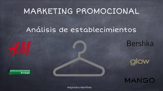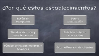 El documento analiza 5 establecimientos de ropa y complementos en Pamplona. Evalúa sus variables geográficas y de visibilidad de productos. Describe la ubicación, distribución interna y orden de cada tienda. Concluye que la situación geográfica y visibilidad de los productos son factores clave para el éxito comercial.